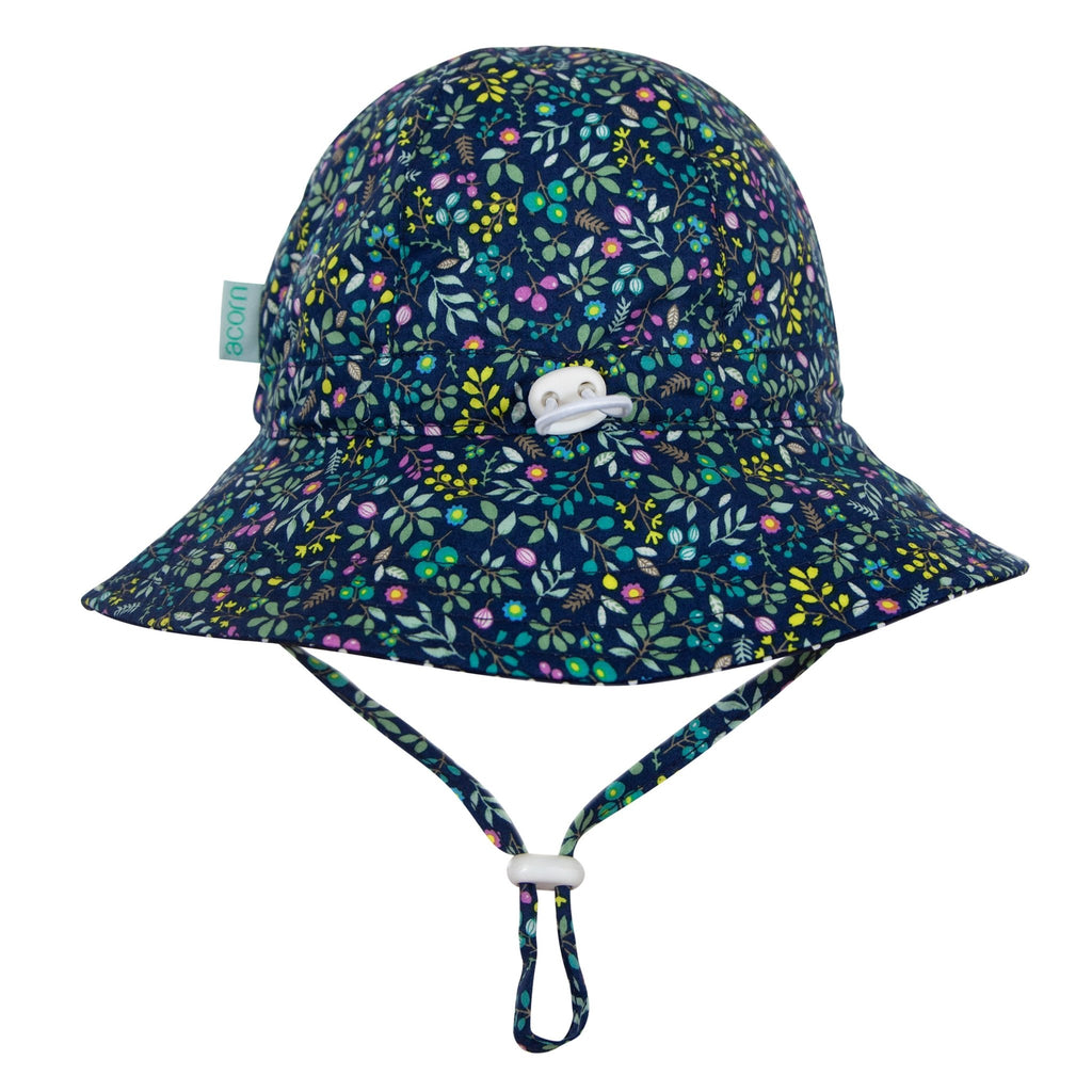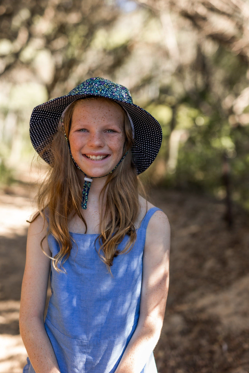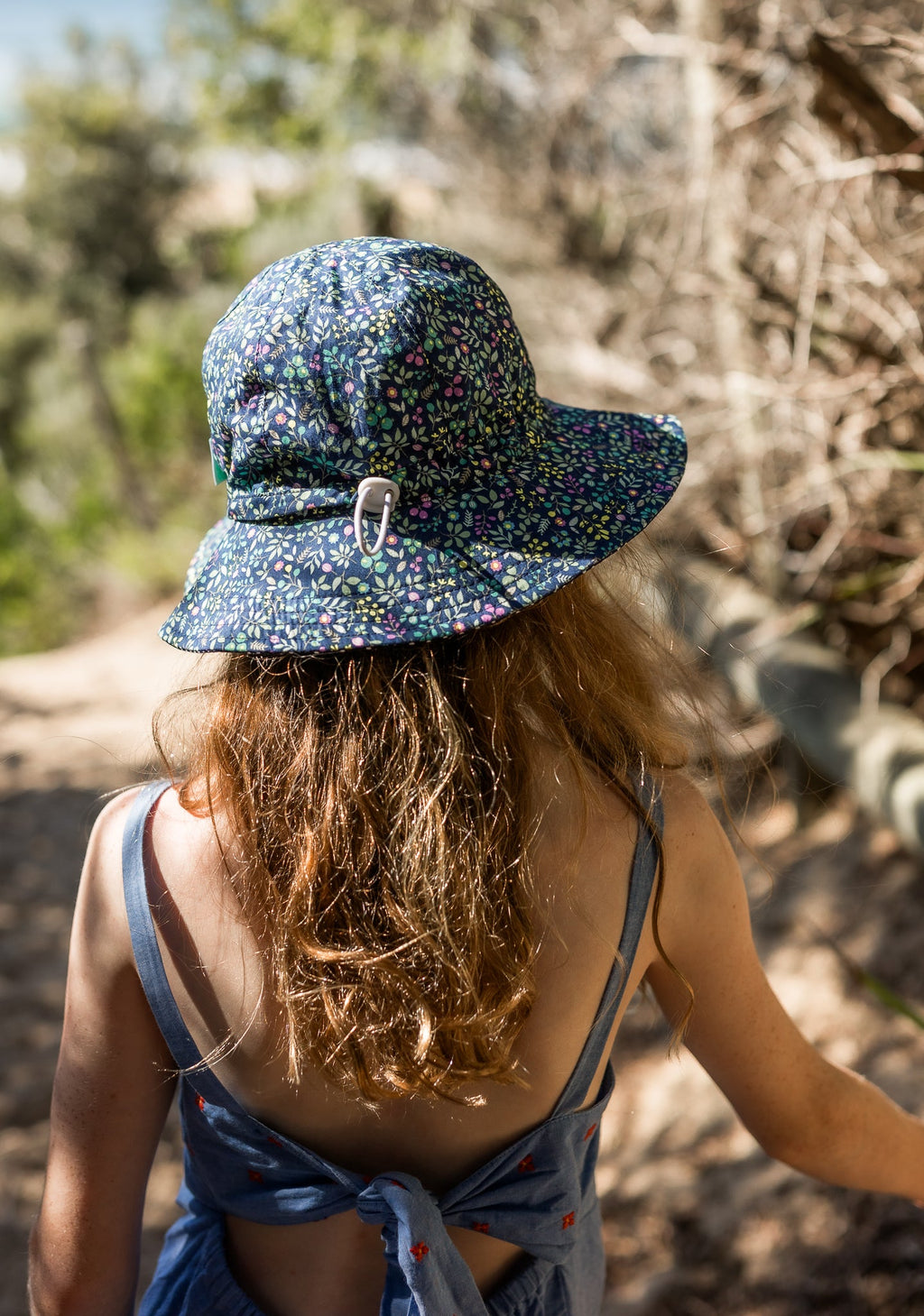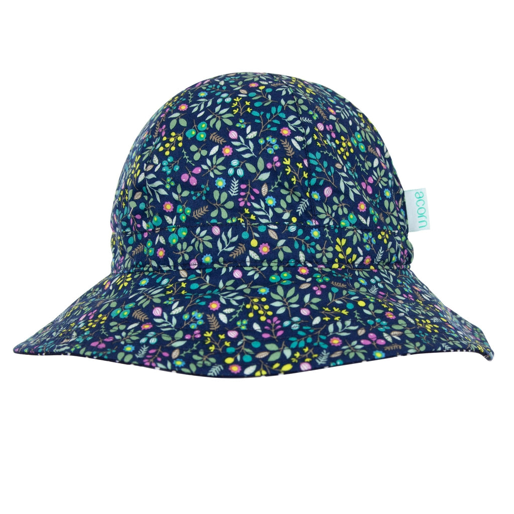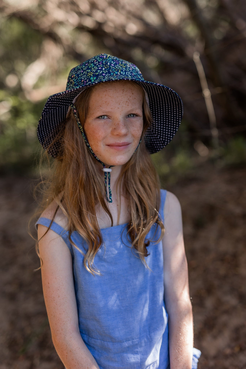 This lovely sunhat features a navy floral print on the outside and a navy and white polka dot print on the inner brim.