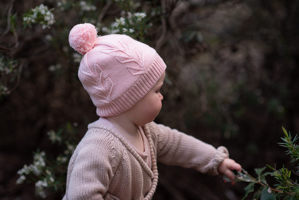 Adorable knitted beanie with a garden vine cable knit pattern.