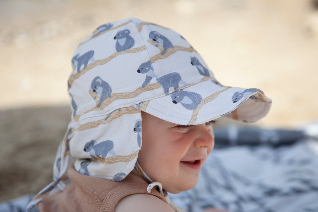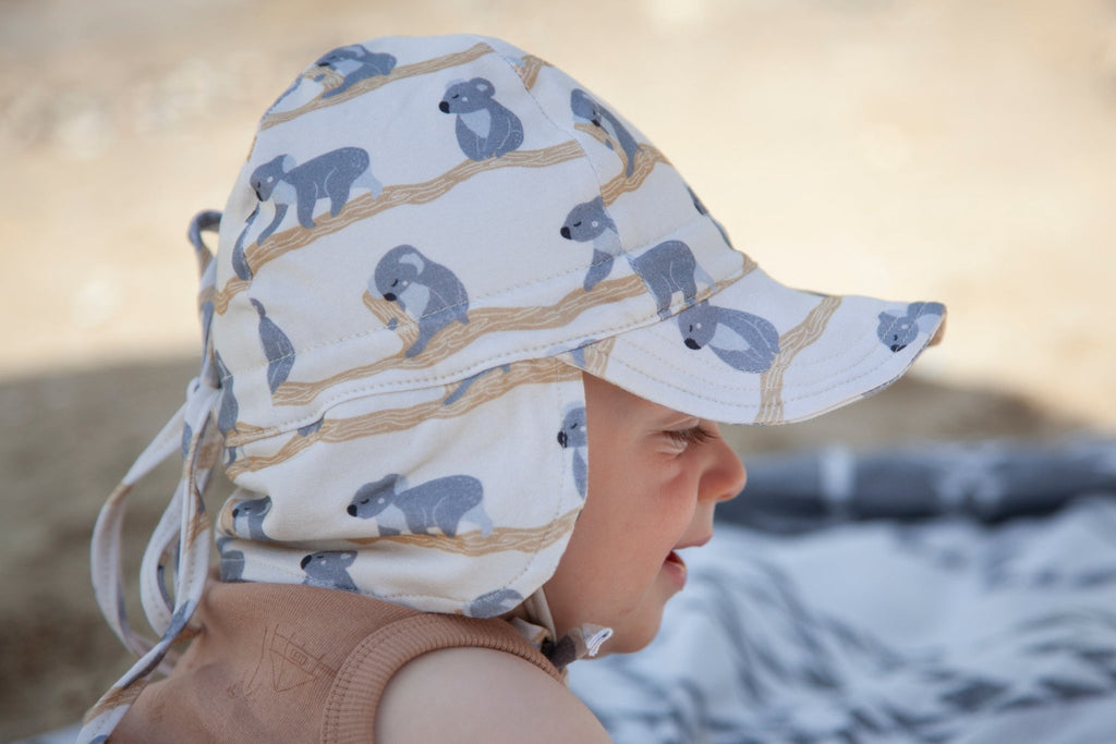 This beautiful flap cap with the sweetest koala print is an adorable way to stay sun-safe this summer. A fantastic neutral design that will go with any outfit.