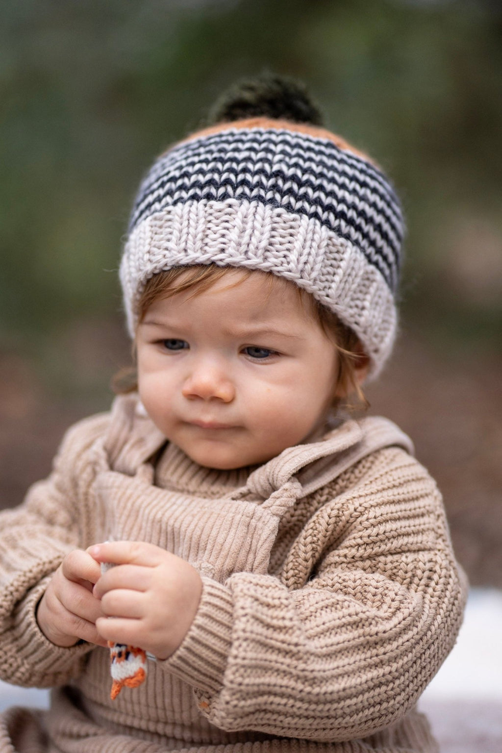 This super soft wool blend knit beanie with a retro stripe pattern and a comfortable and stretchy 2x2 ribbing at the face.