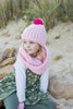 Lovingly hand-knitted, this chunky knit beanie with a fun super sized contrast pom pom is crafted with a fisherman's rib stitch that is super stretchy and extremely comfortable when worn.
