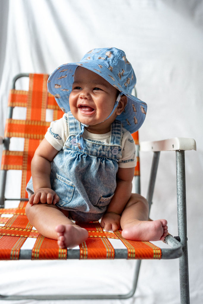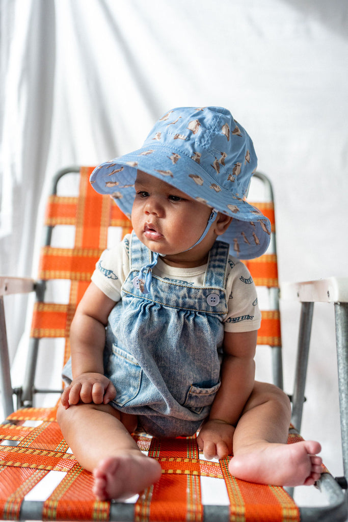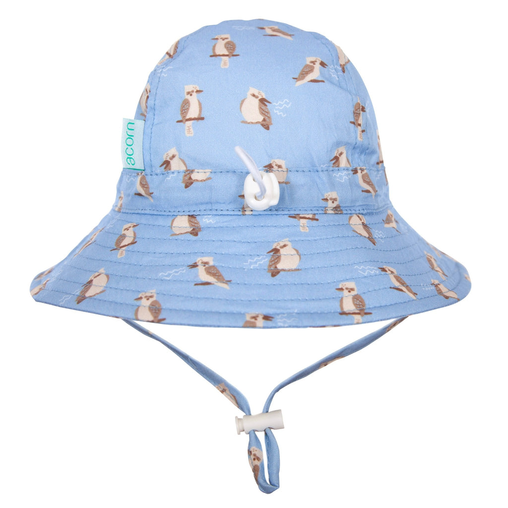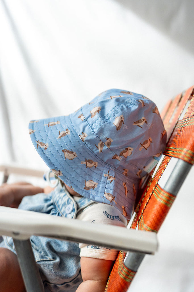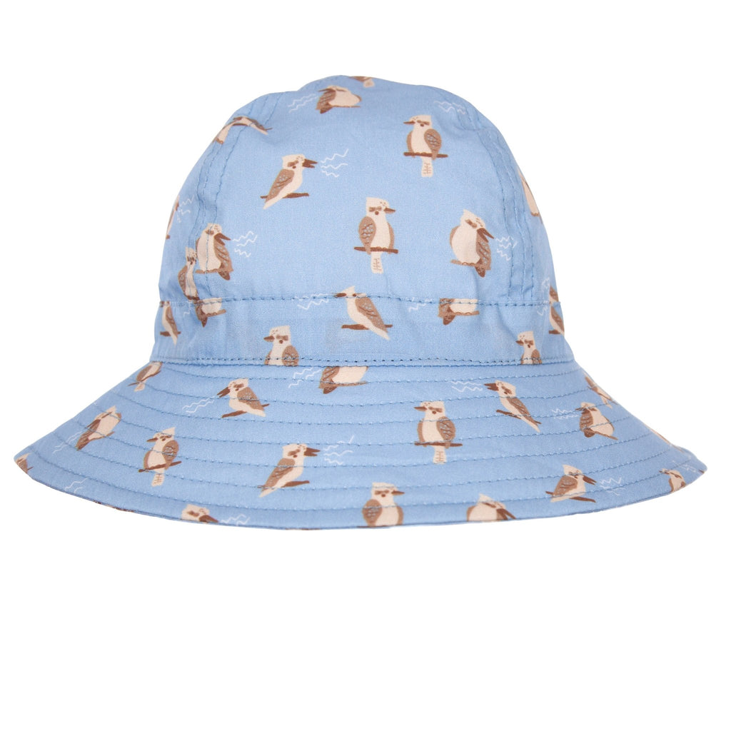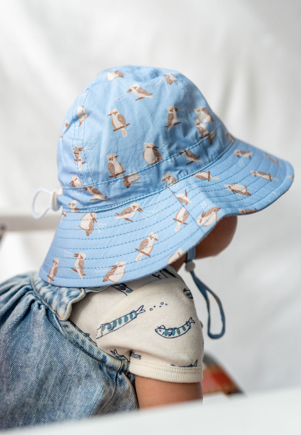 Baby sun hat with a gorgeous blue Kookaburra print designed by Melbourne artist, Jacinta Weir.