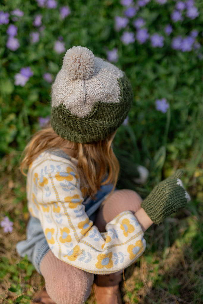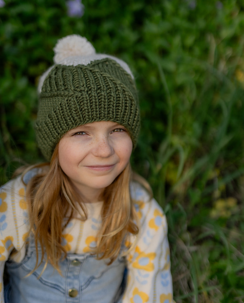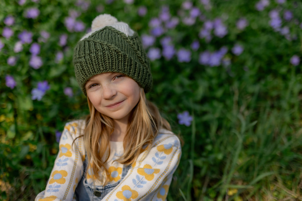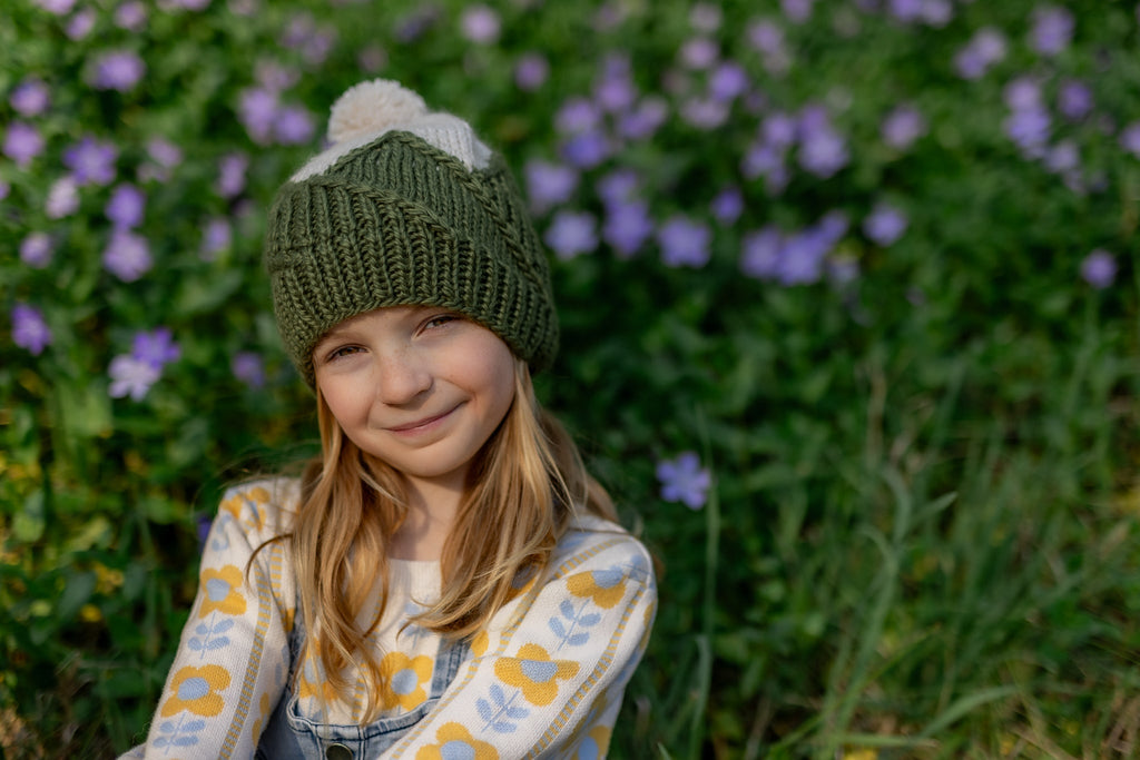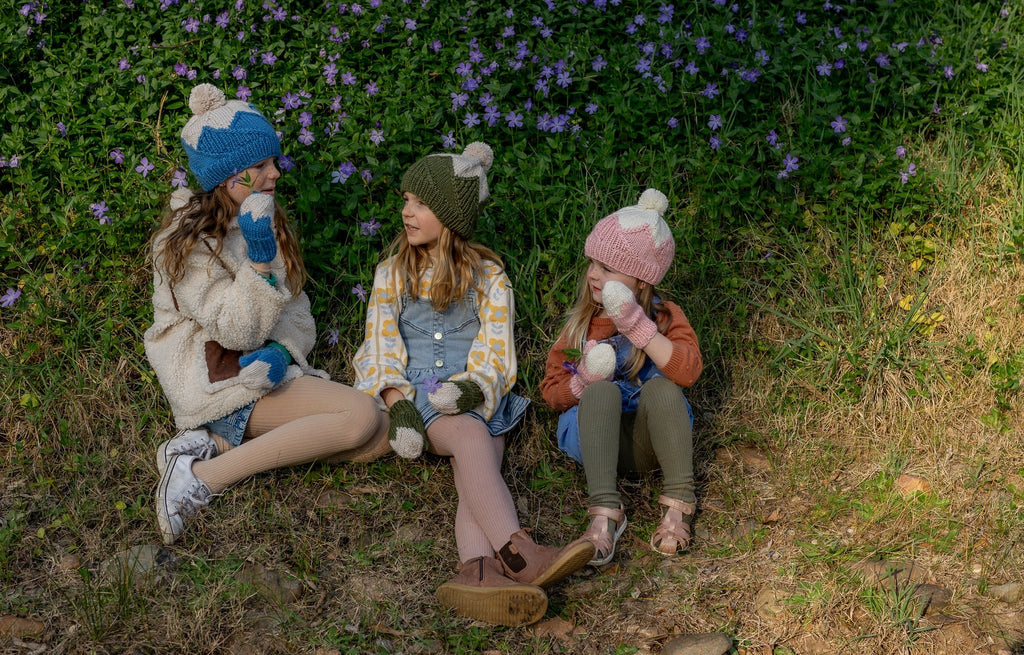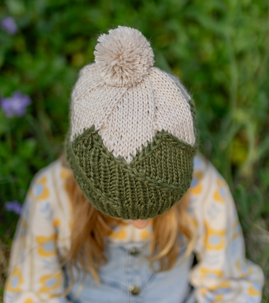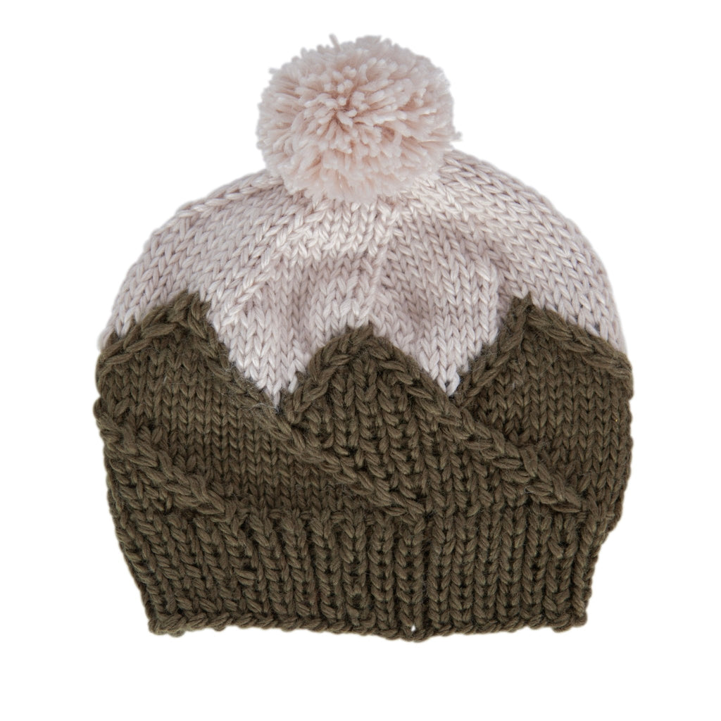 This adorable beanie features a mountain top pattern on the main body that is very stretchy and comfortable when worn, a gentle ribbing at the face, and a fun pom pom on top.