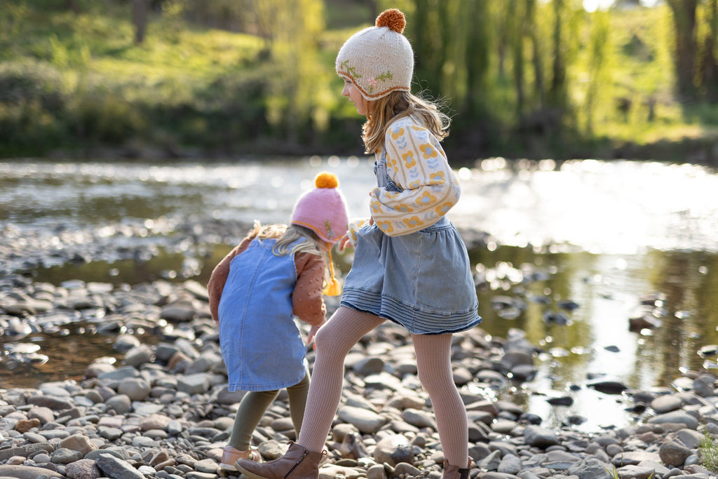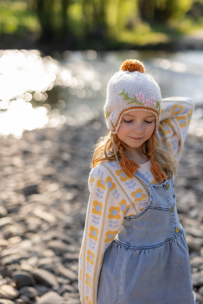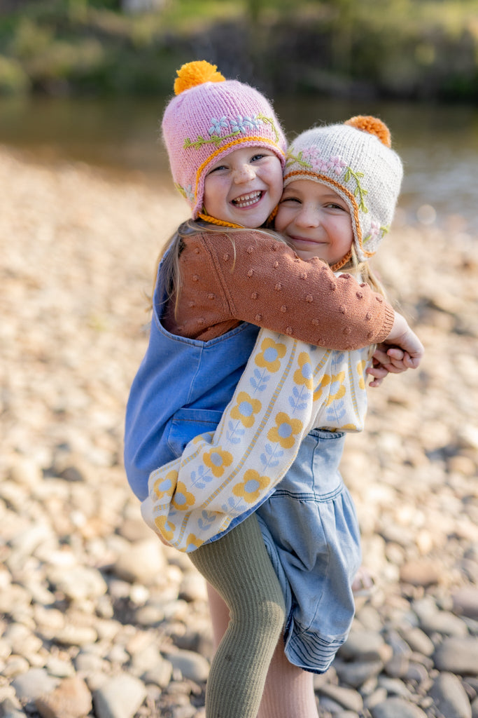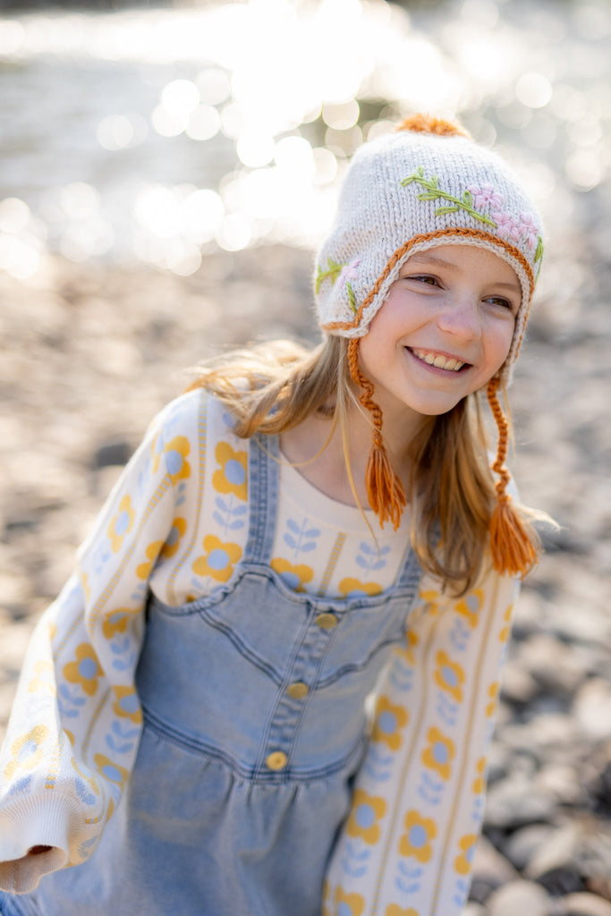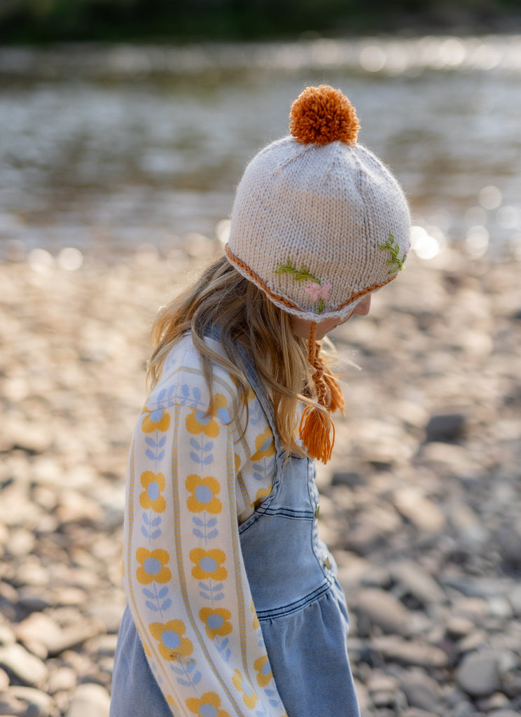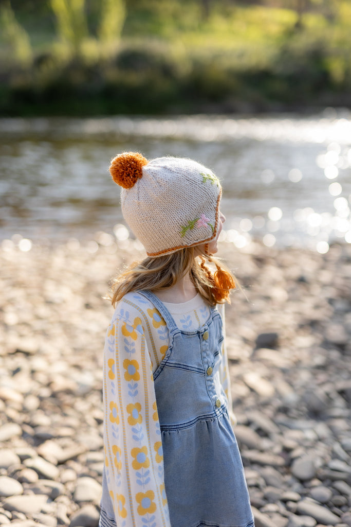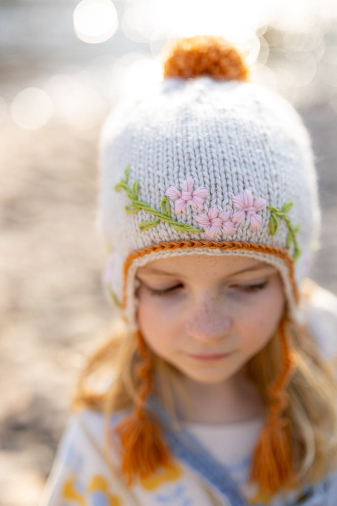 The Parisian Beanie is the perfect blend of warmth and style for the winter season. Hand-knitted with a luxurious wool blend yarn, this beanie has exquisite hand-embroidered floral and branch details on the front, along with contrasting stitching around the edge. Complete with side plaited ties and tassels, it's a must-have accessory for any fashion-savvy little one this season.