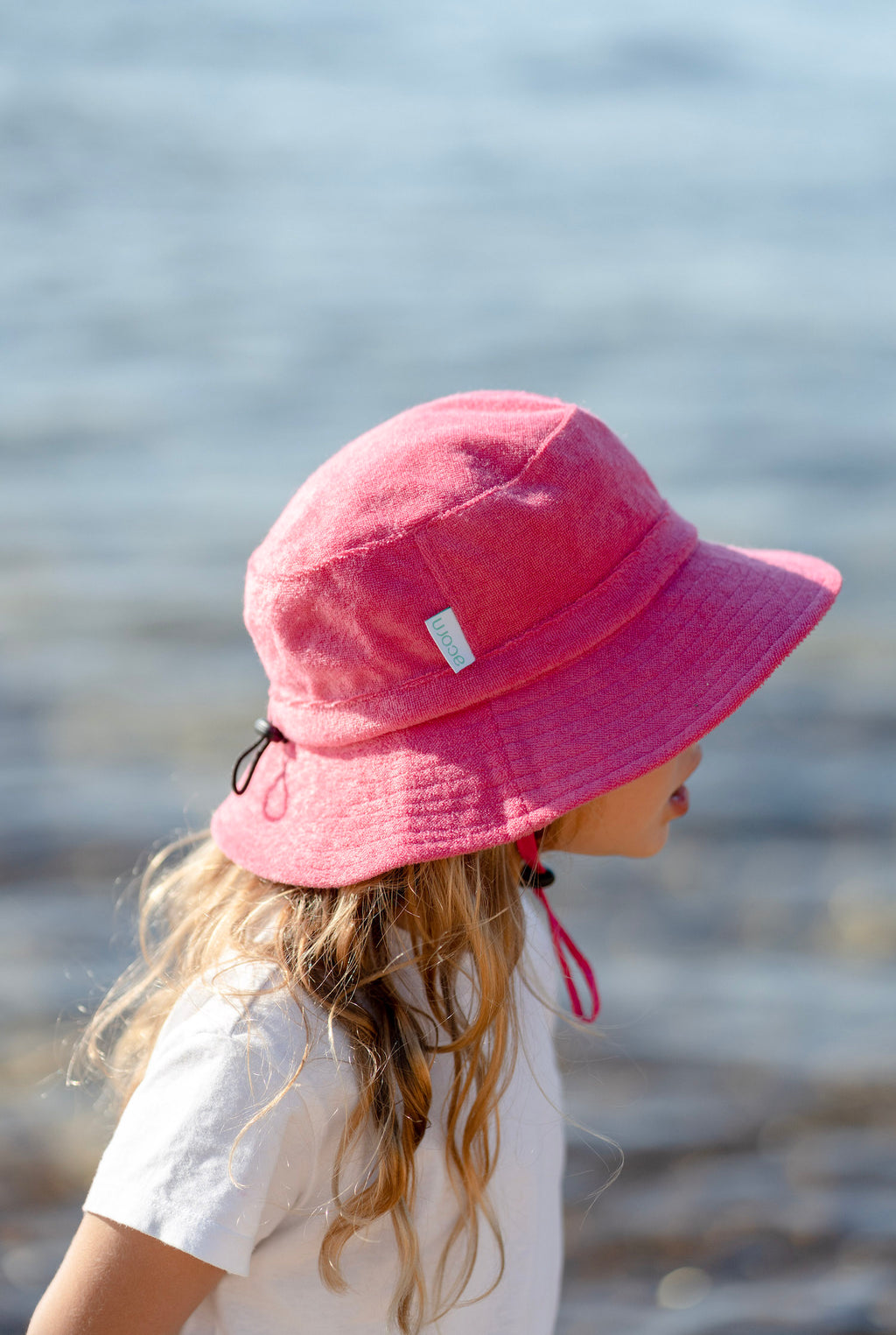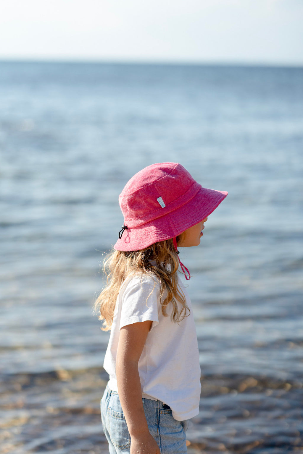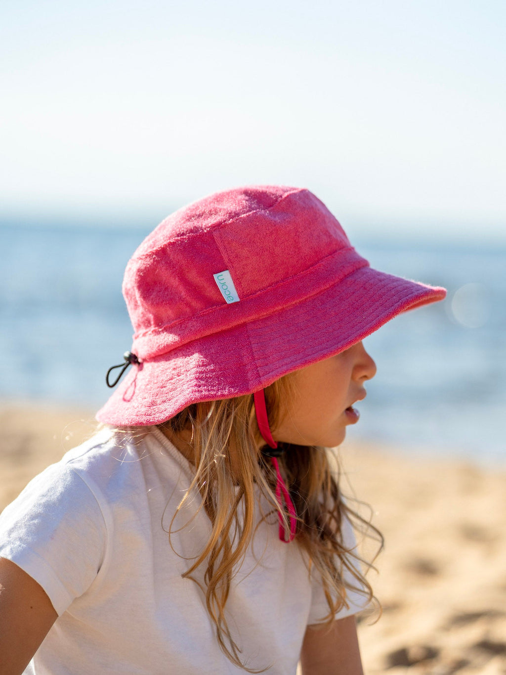A fun terry towelling bucket hat in hot pink with a light pink contrast pocket on the side is giving all the cool retro vibes and a dash of Barbie-inspired fun.
