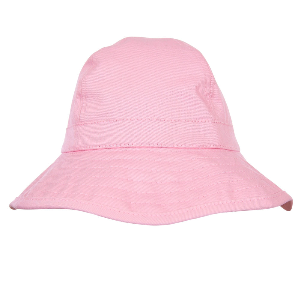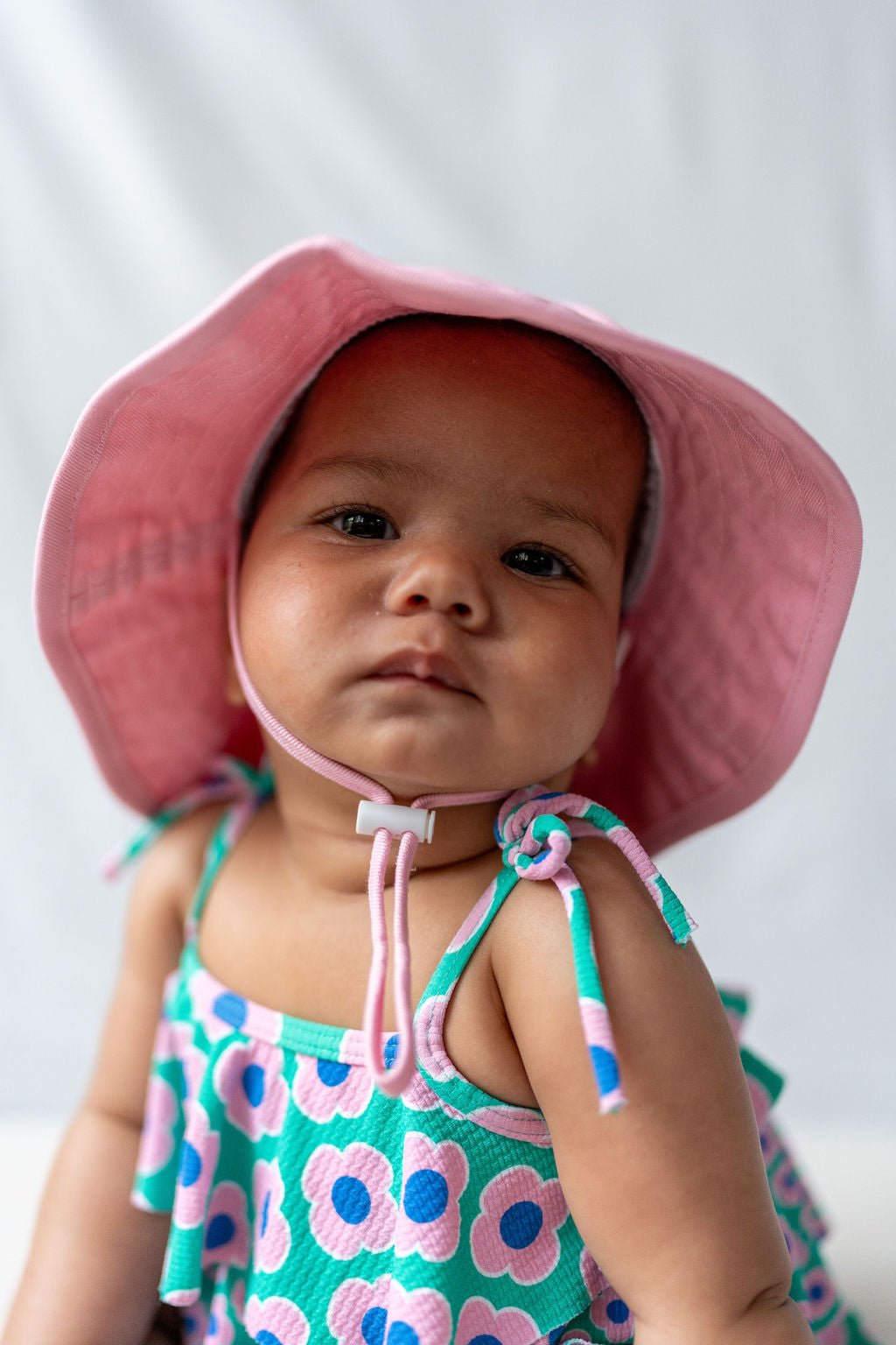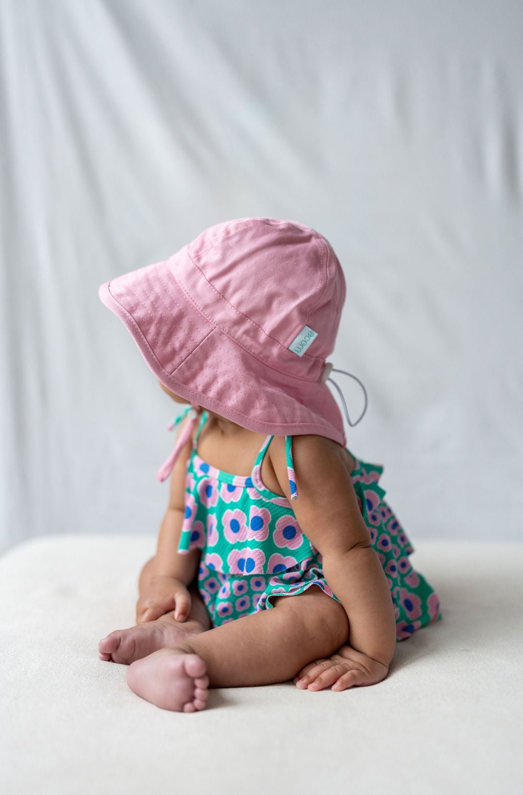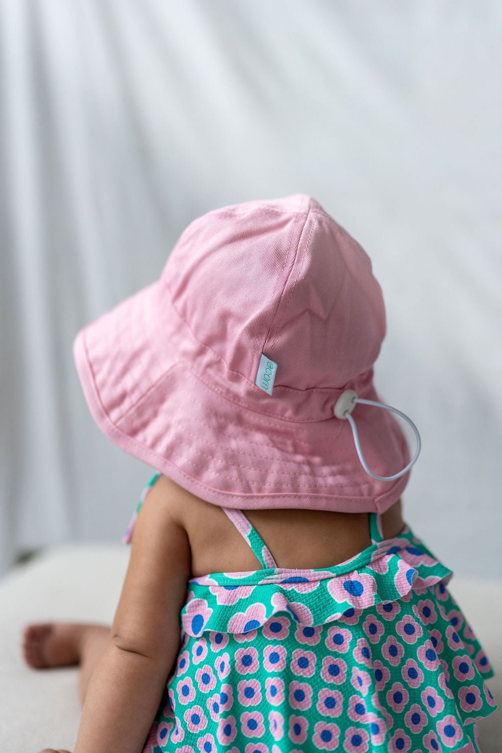 Baby sun hat with a sweet pink cotton canvas fabric.