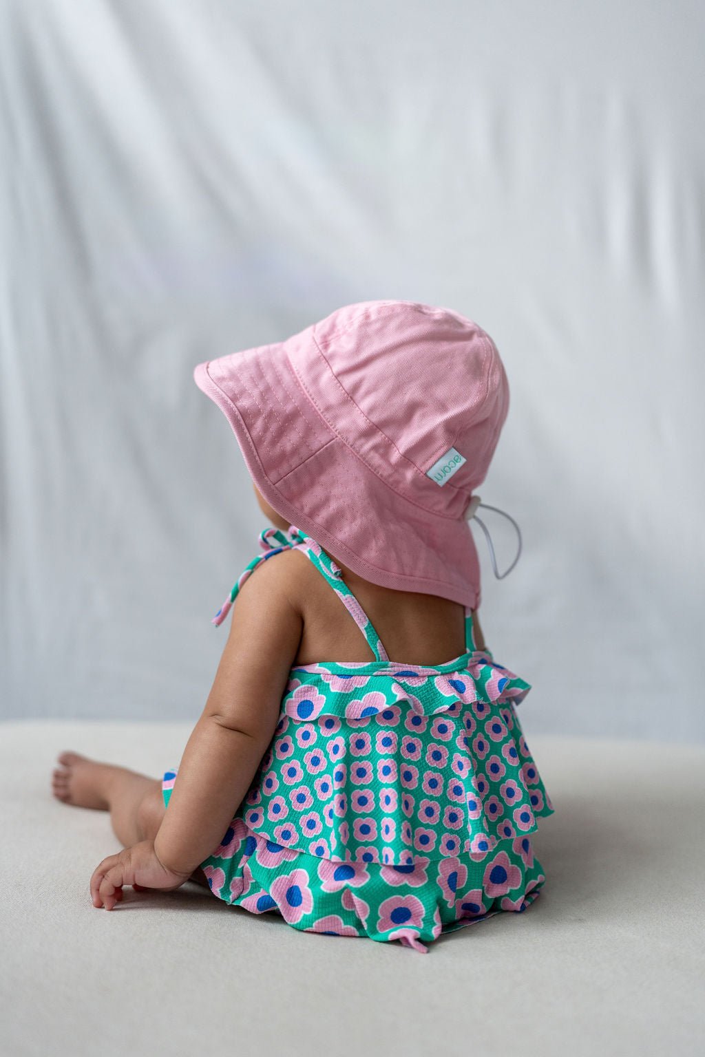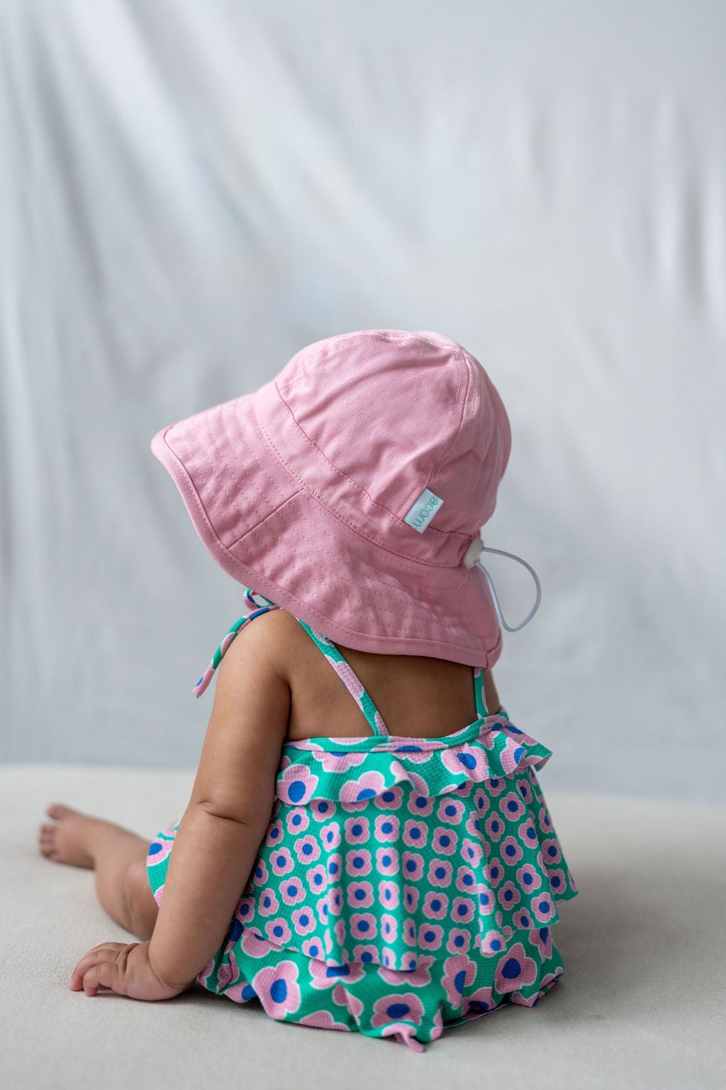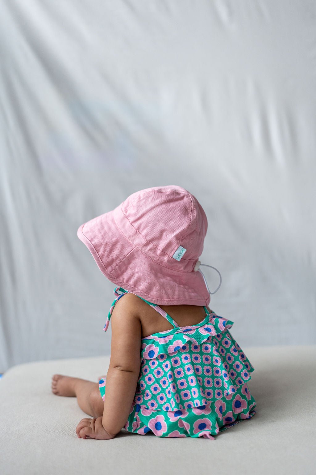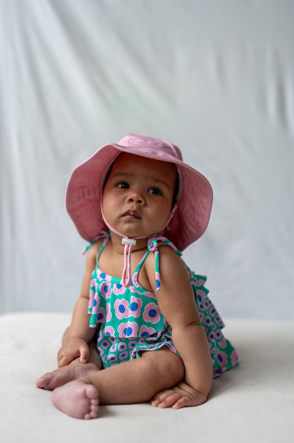 Baby sun hat with a sweet pink cotton canvas fabric.