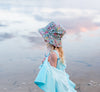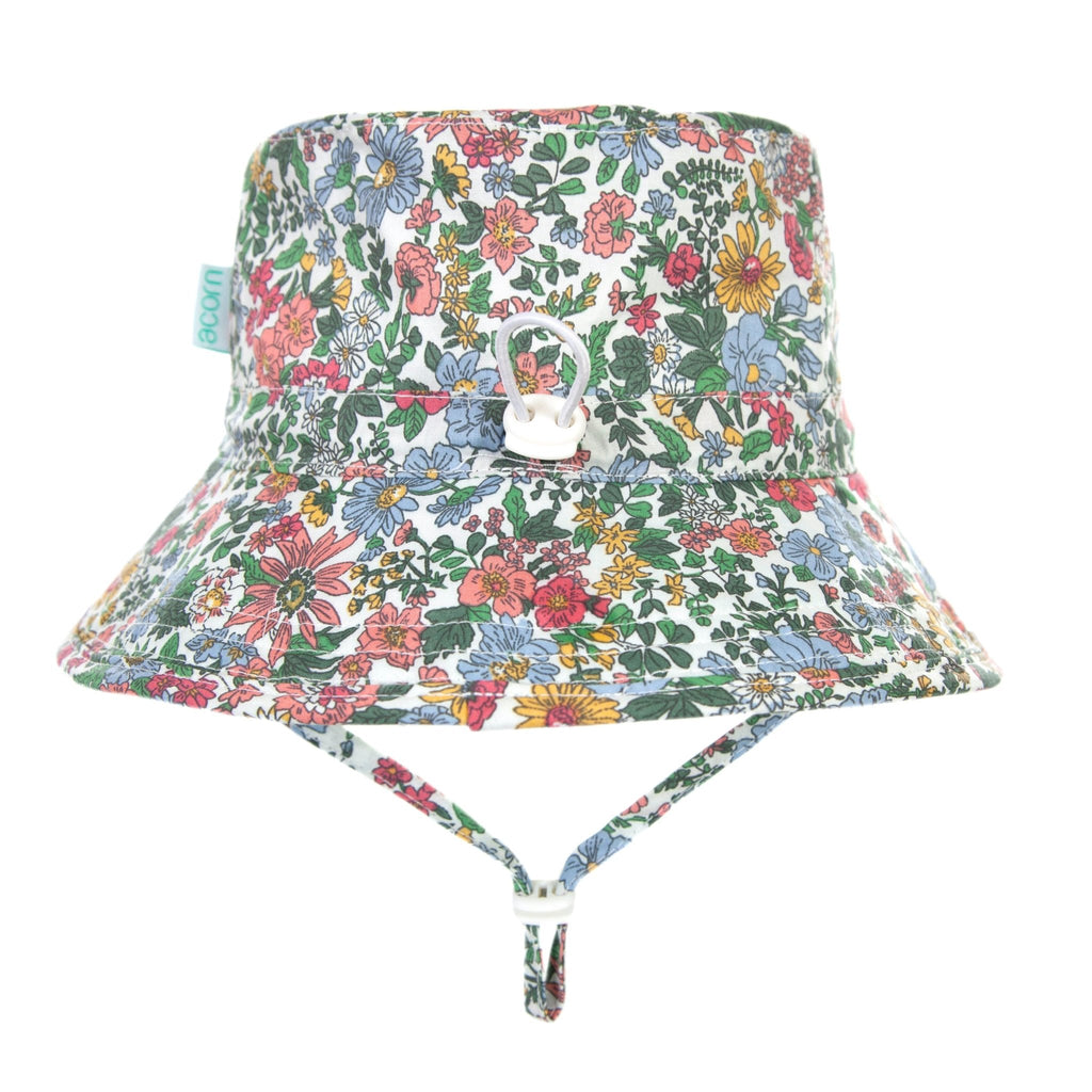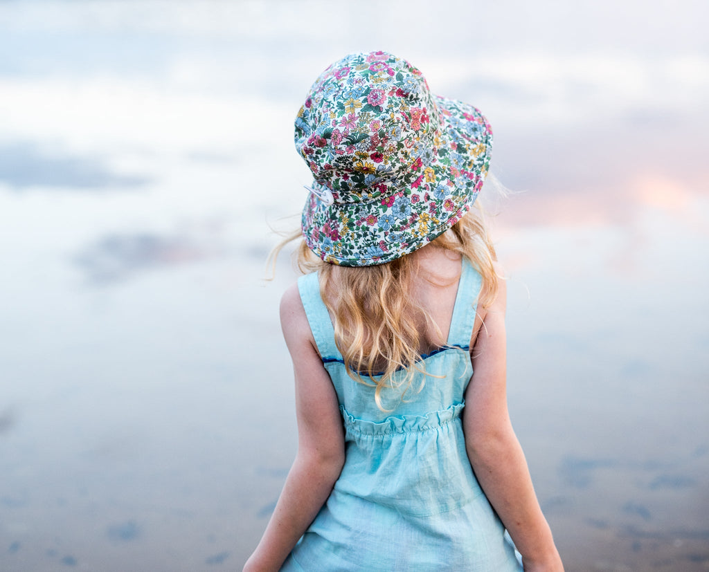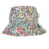 A gorgeous bucket hat, featuring a cream-based floral print on the outside and a blue and white spot print on the inner brim.