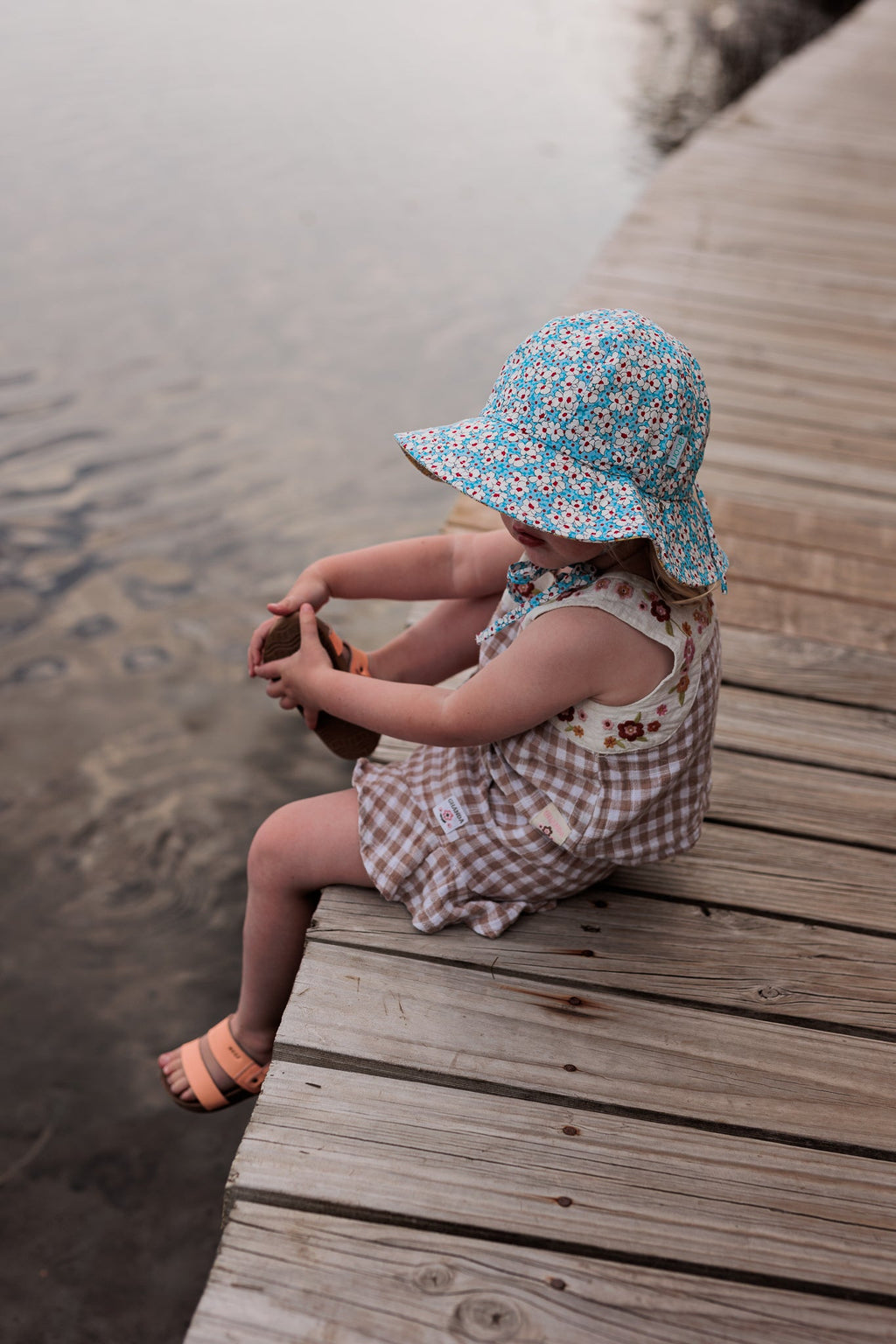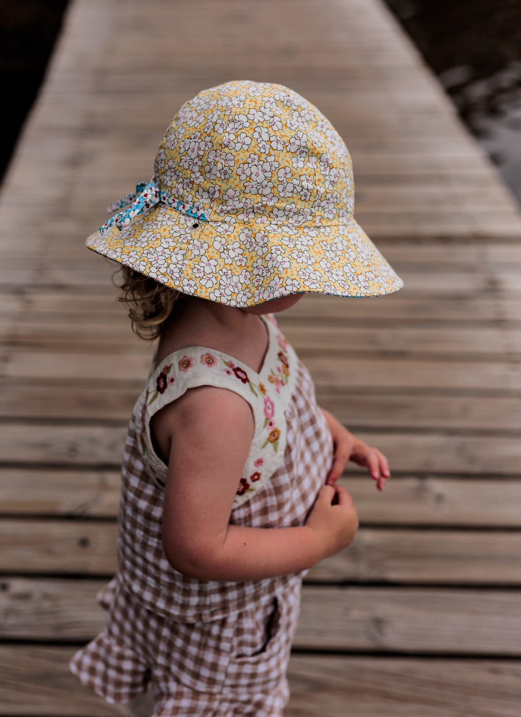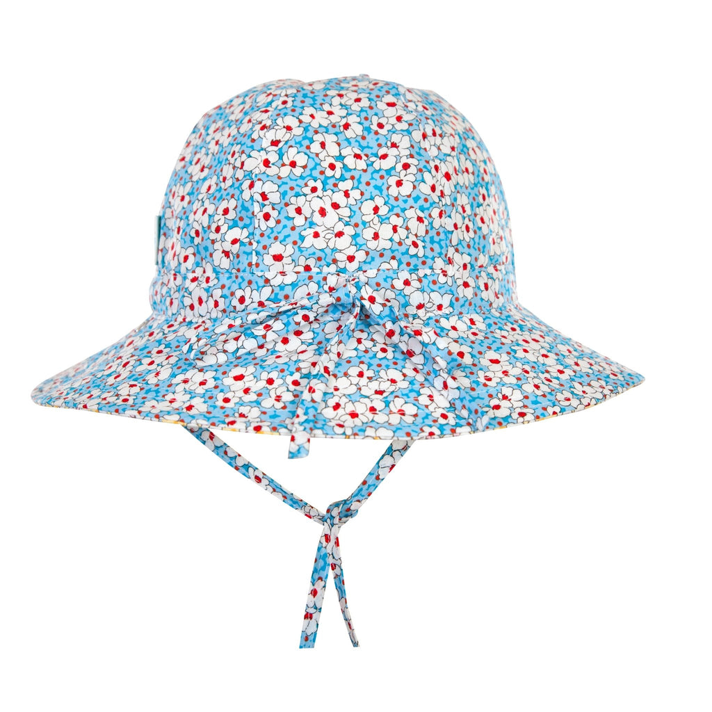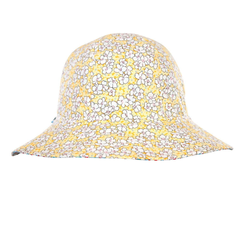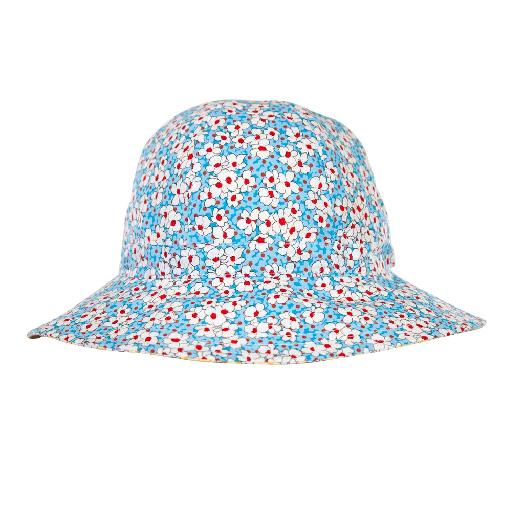 A stunning reversible wide brimmed sunhat with a blue and red floral print on the outside and a yellow and pink floral print on the reverse.