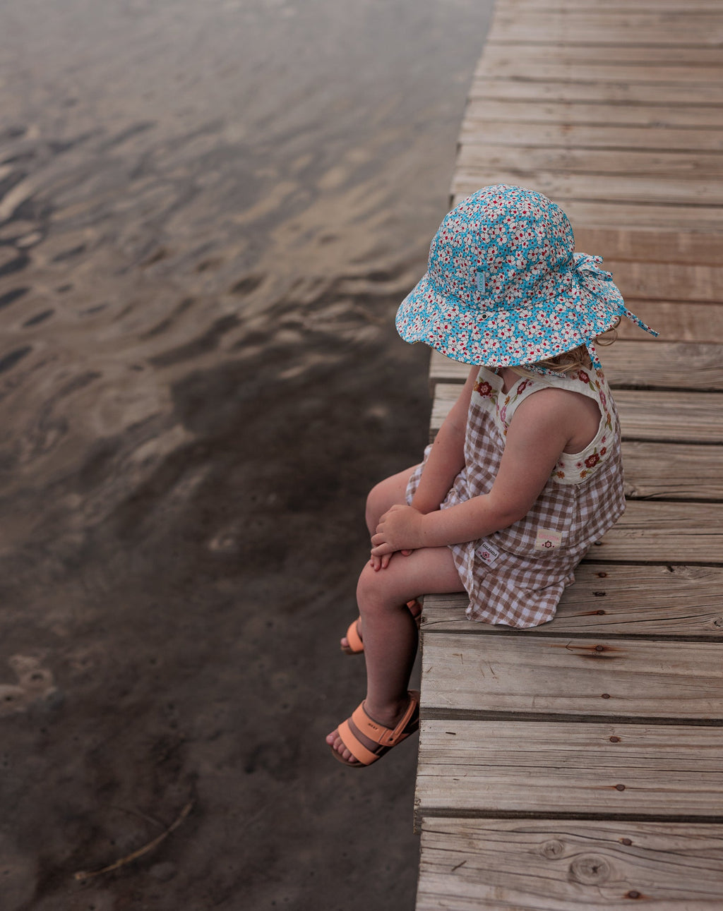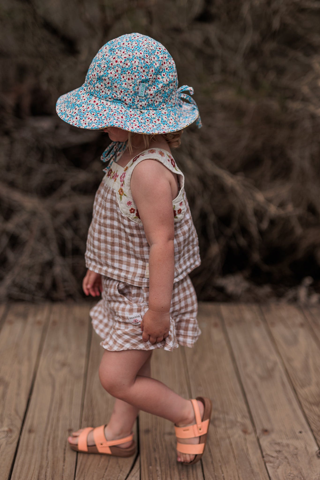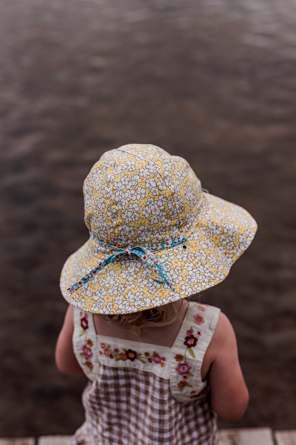 Features a chin cord with tie (no toggle) that can thread through eyelets on the brim to reverse the hat and then tie up under the chin to keep the hat in place when worn.