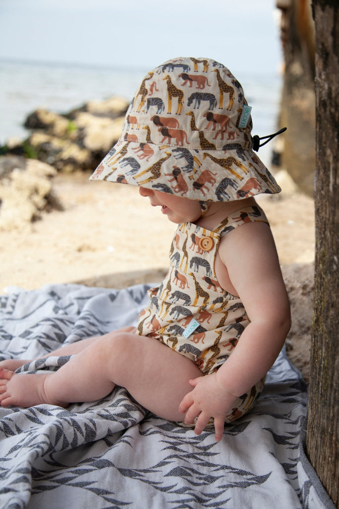 The infant hat is size XS (0-9 Mths) and features an elasticated toggle around the head for a perfect fit, as well as a cord and toggle under the chin to keep the hat secure. For added safety, the chin cord includes a safety release snap. The hat also boasts a wide brim (measuring 6cm) that provides ample shade and protection without obstructing vision.