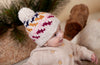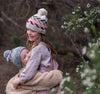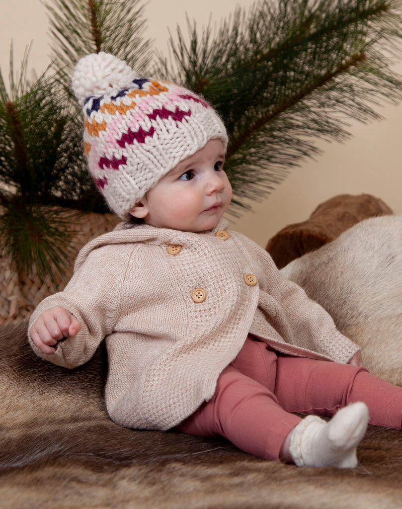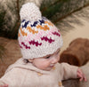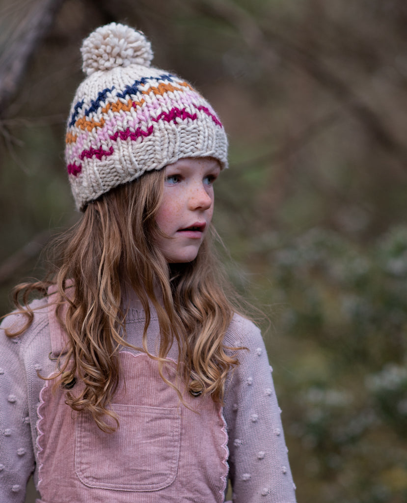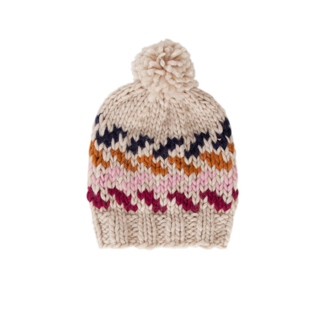 Adorable hand-knitted chunky beanie with a multi coloured zig zag pattern, a wide and comfy ribbing at the face and a cute pom pom on top.