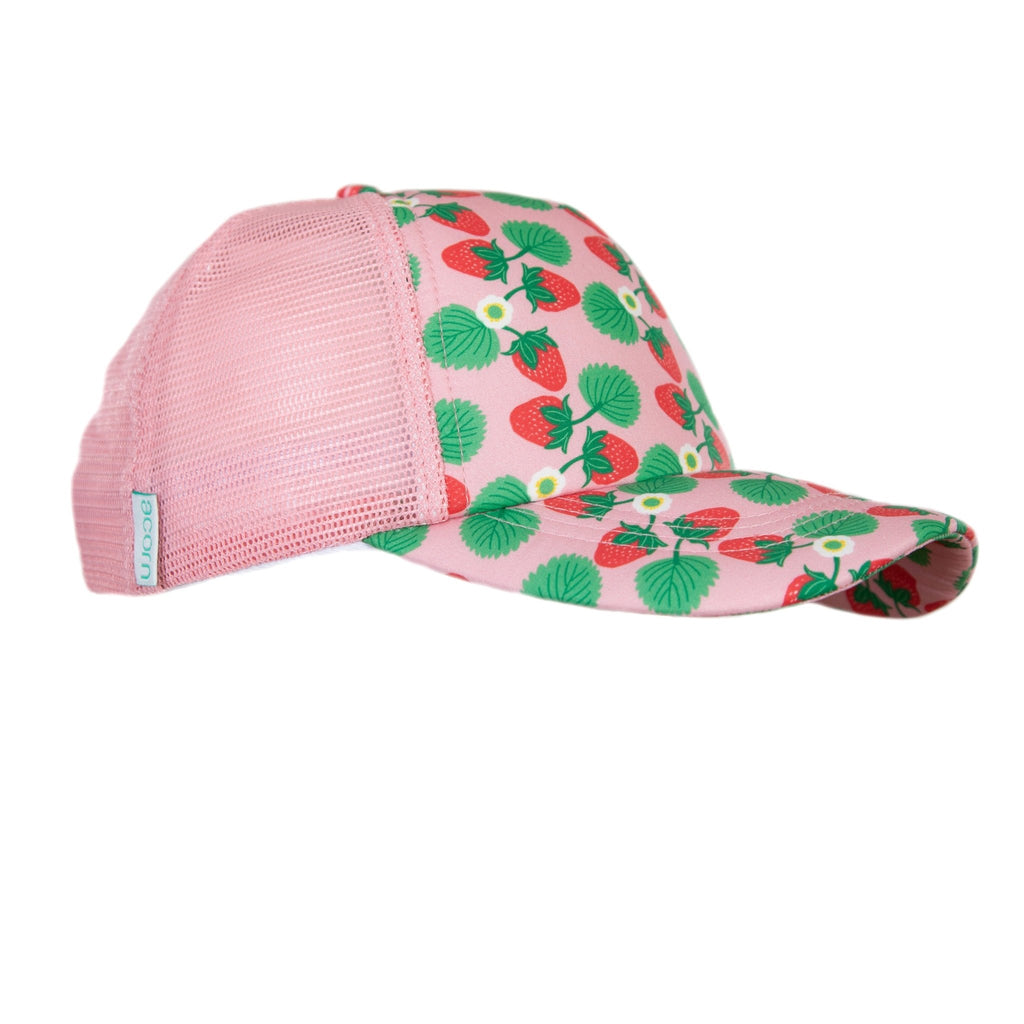 Get set for summer time fun with this a super cool trucker cap with a pink based strawberry print on the peak and visor. The original artwork was designed in Melbourne by artist, Jacinta Weir.