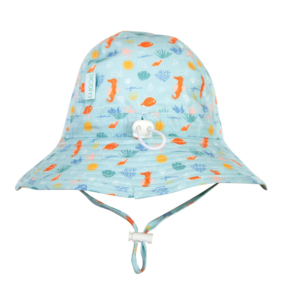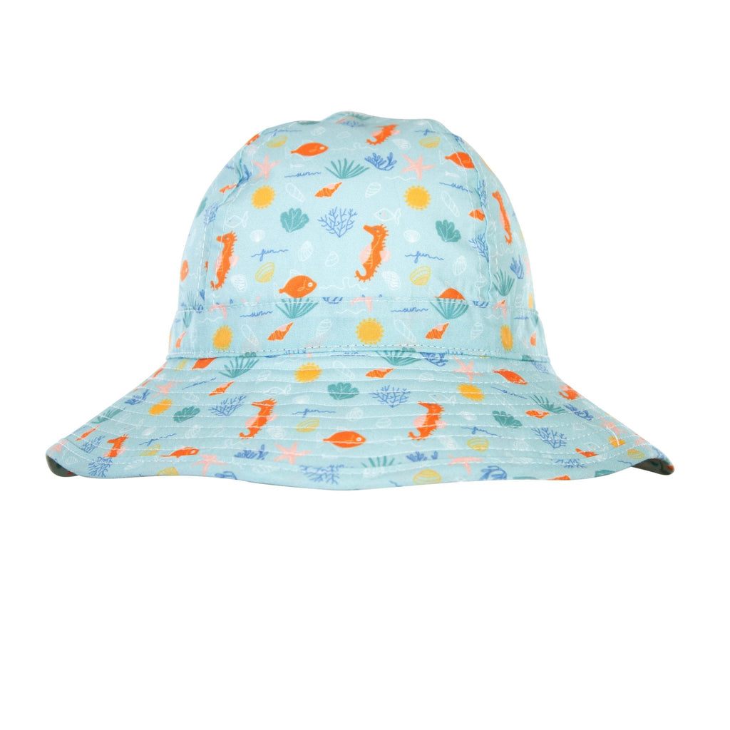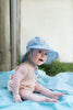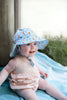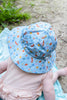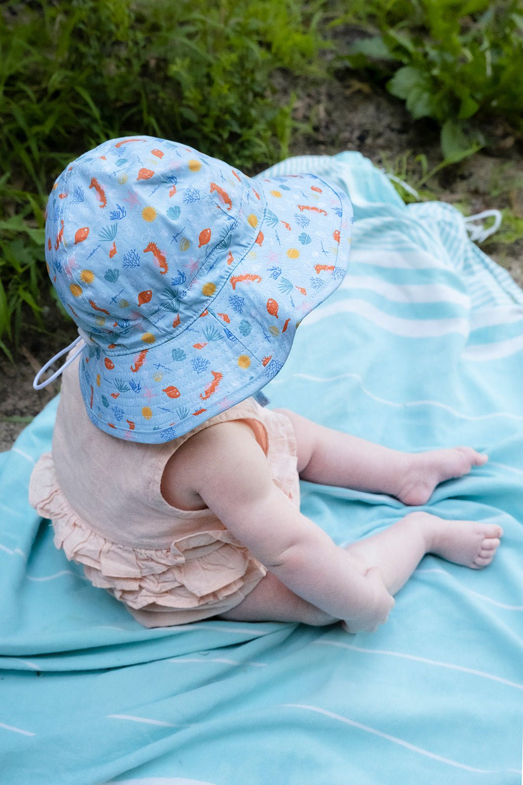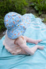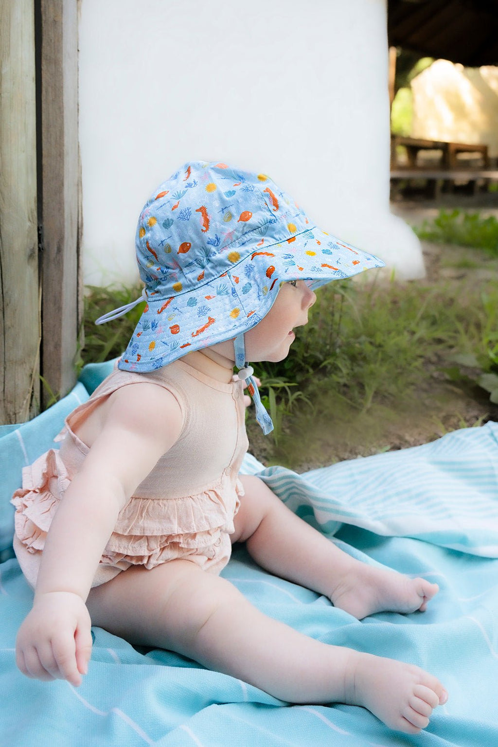 A super cute infant sunhat with a aqua based ocean inspired print designed by local artist Jacinta Weir.