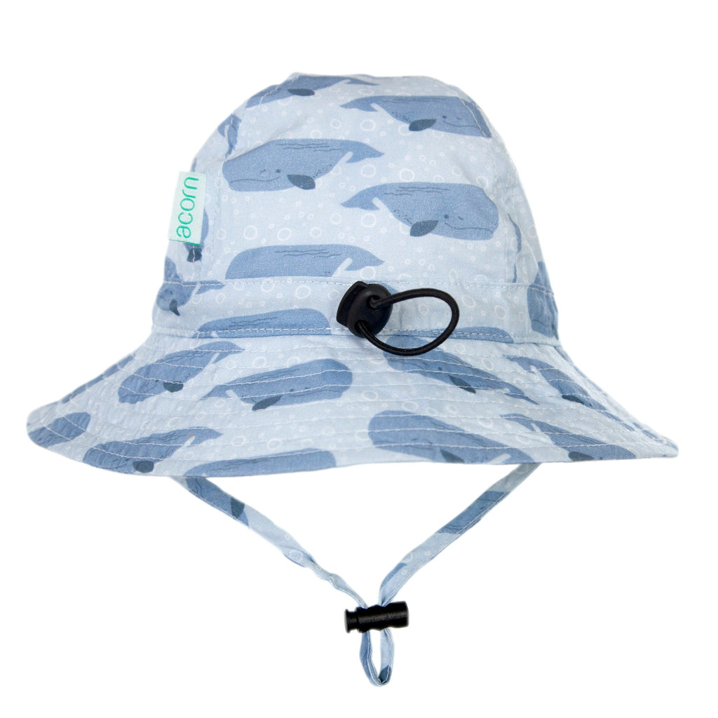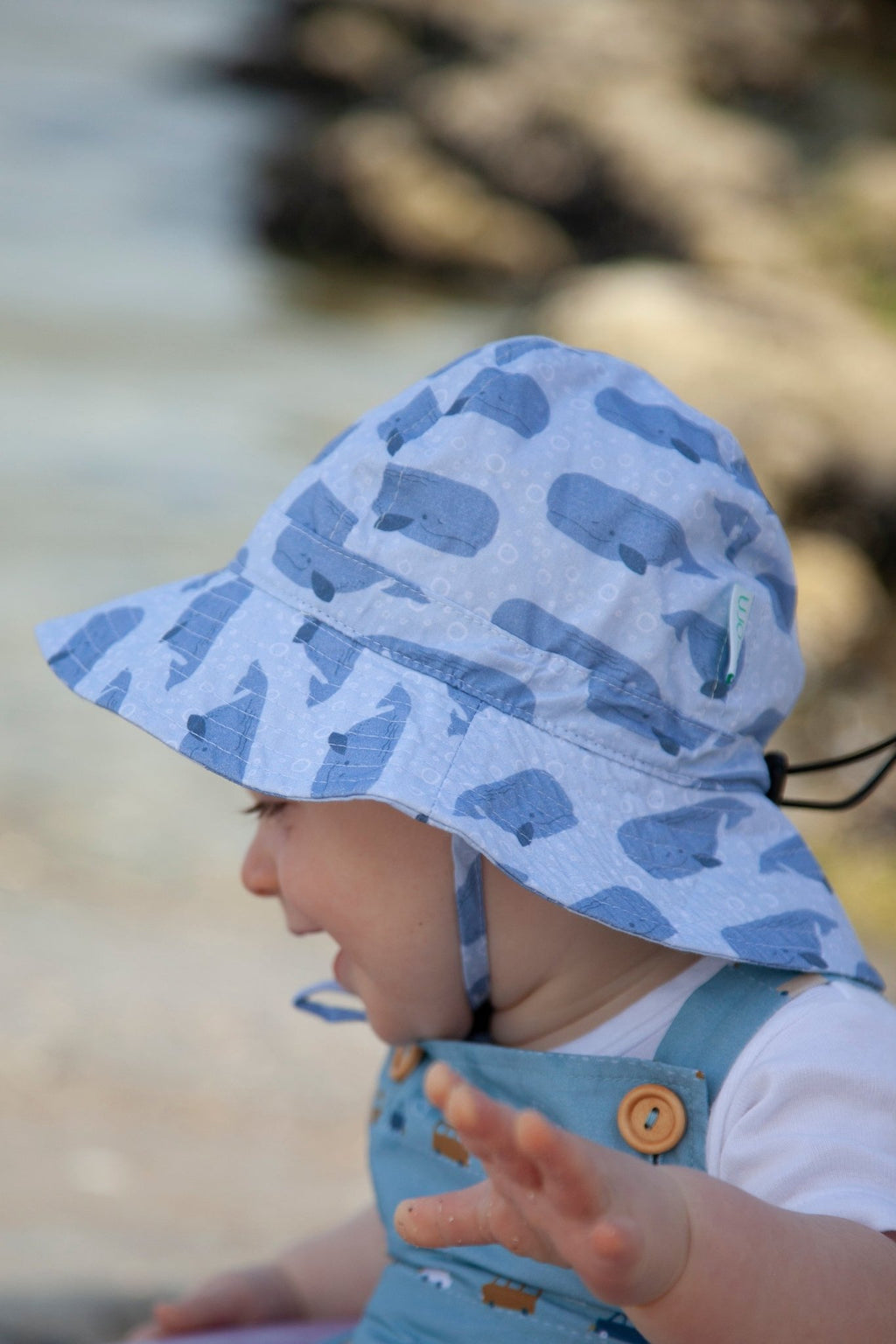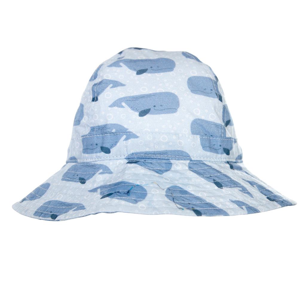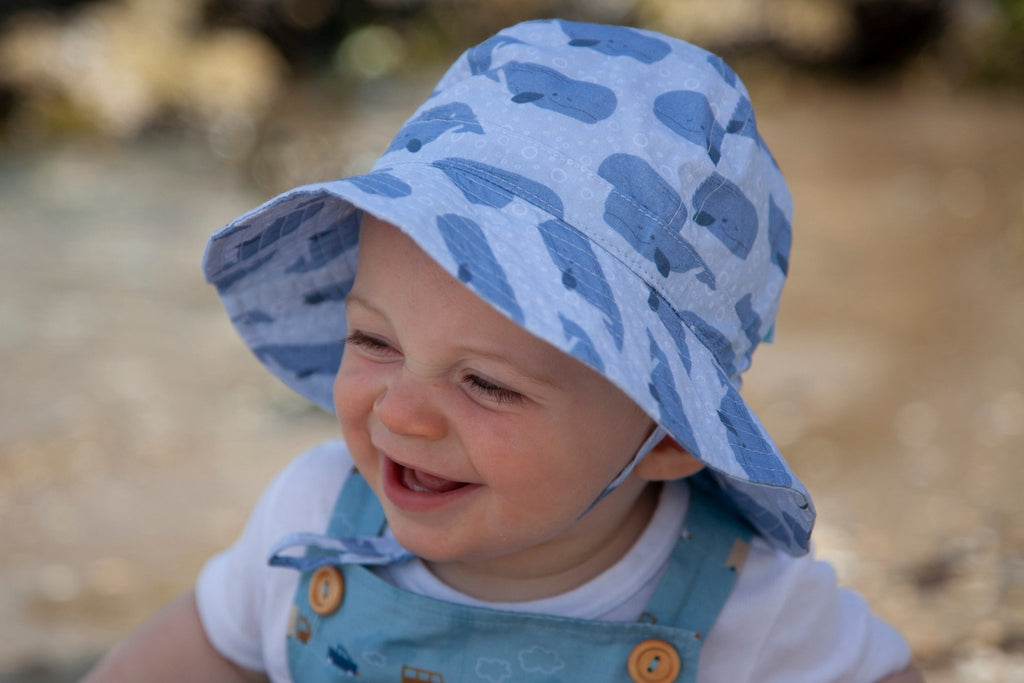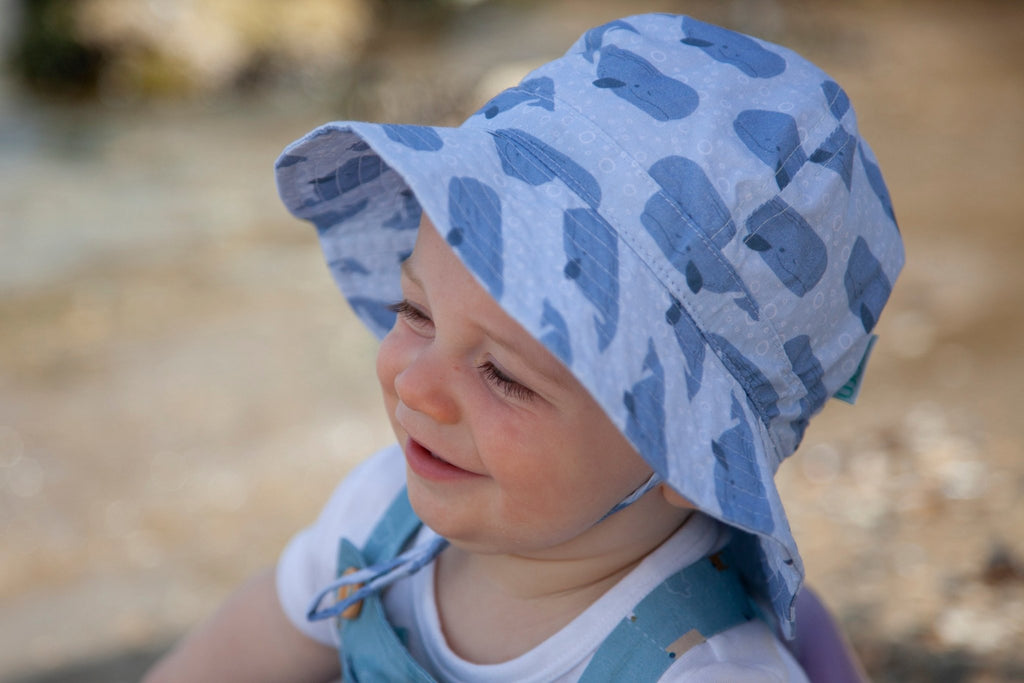 Gorgeous infant sun hat with a sweet blue toned whales print designed in Melbourne by Jacinta Weir from Two Little Ducklings.