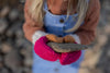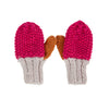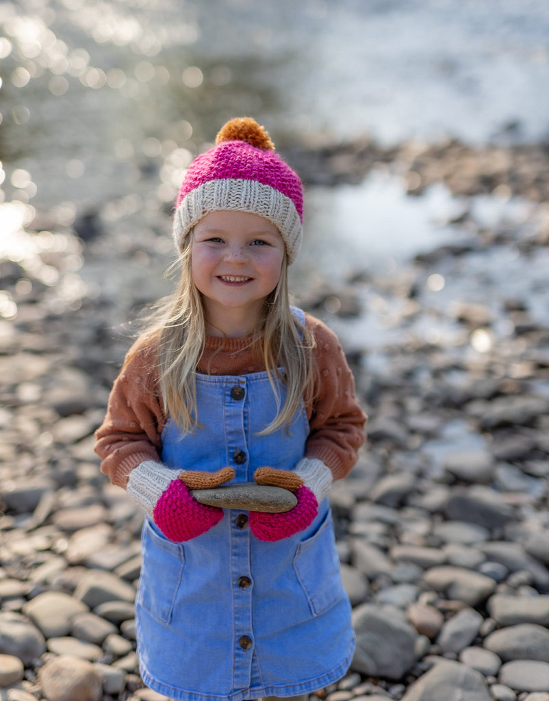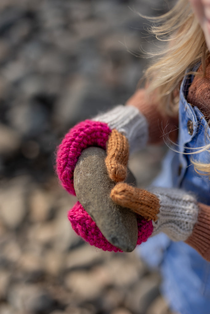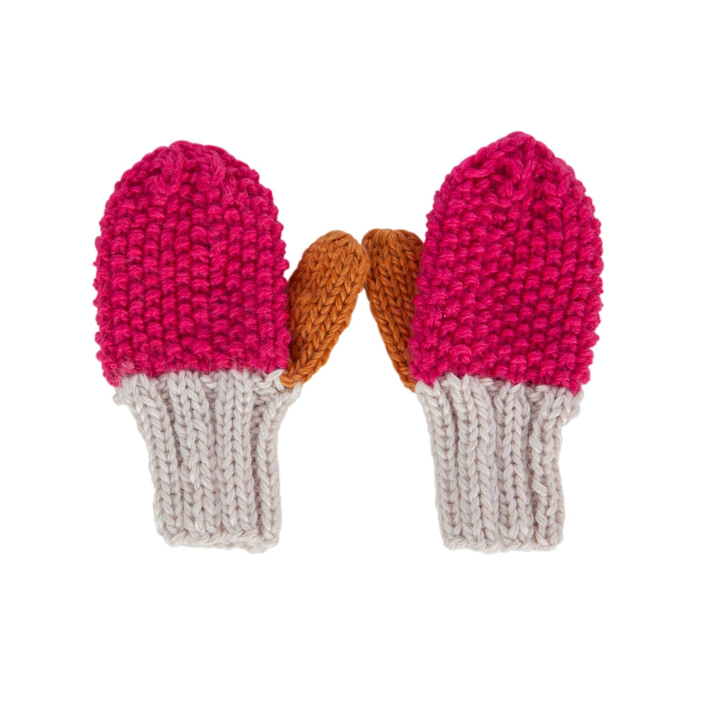 These adorable mittens feature a moss stitch pattern on the main body that is very stretchy and comfortable when worn, a gentle ribbing at the wrist, and a fun contrast thumb colour.
