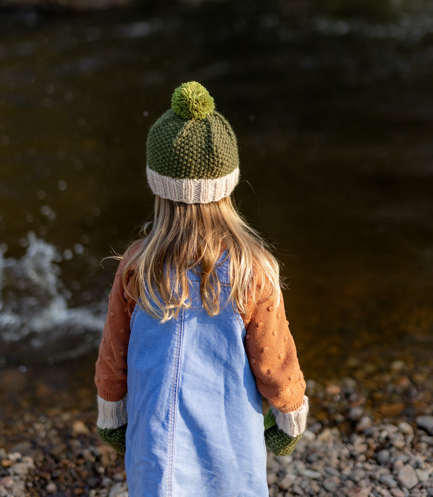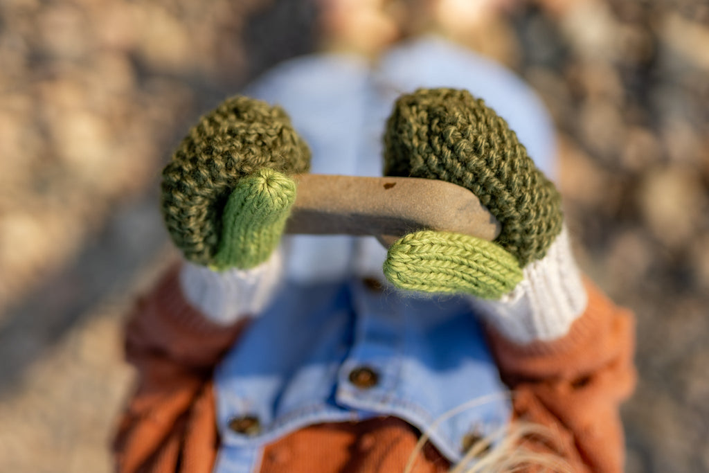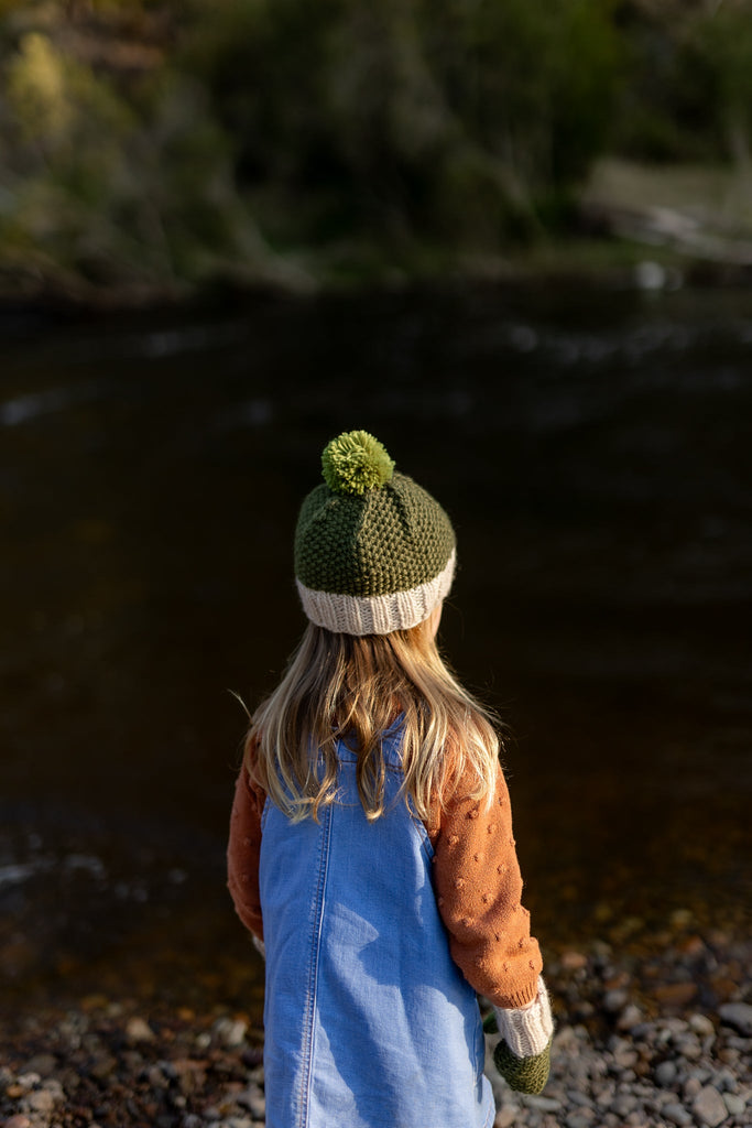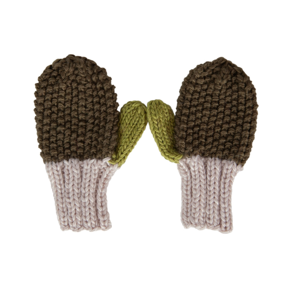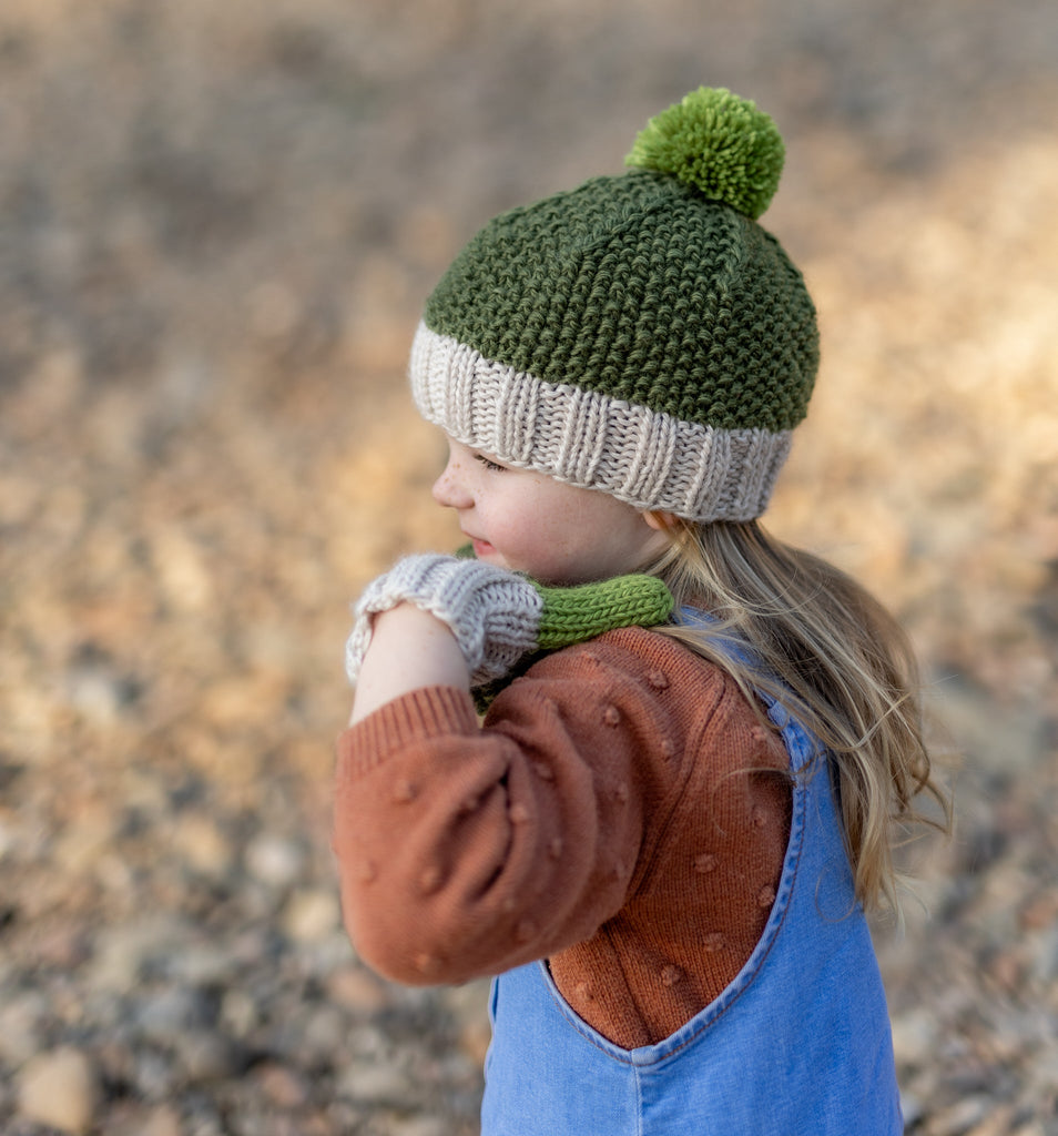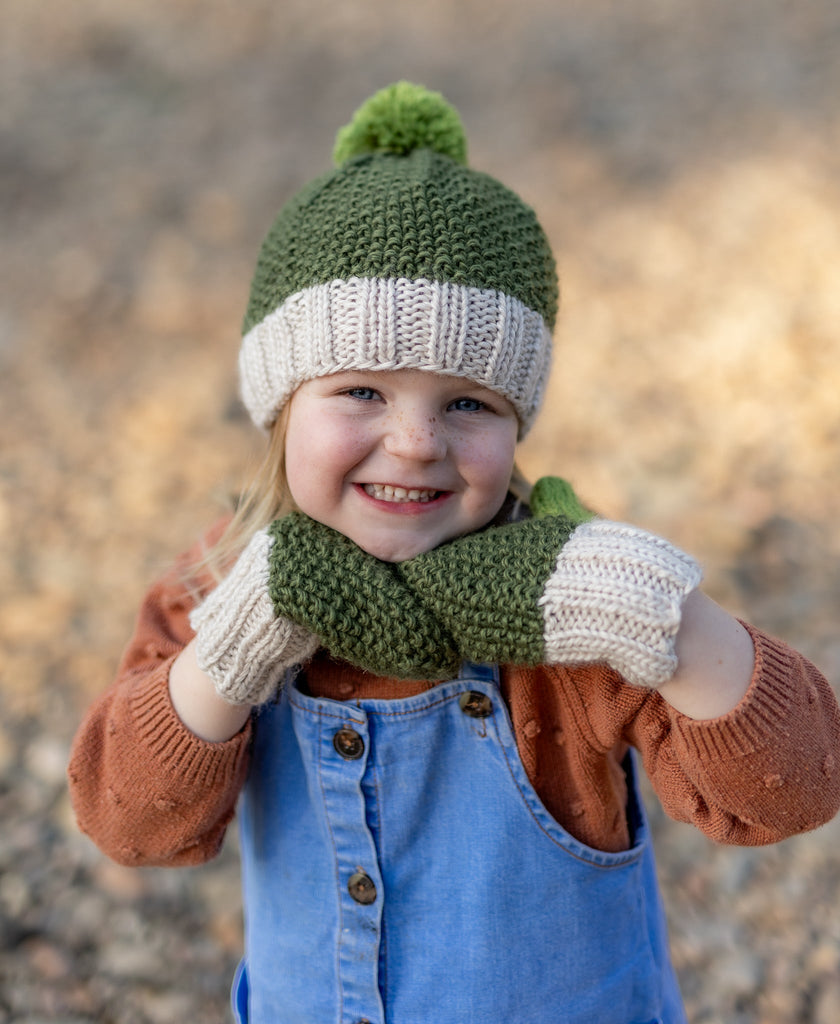 These adorable mittens feature a moss stitch pattern on the main body that is very stretchy and comfortable when worn, a gentle ribbing at the wrist, and a fun contrast thumb colour.